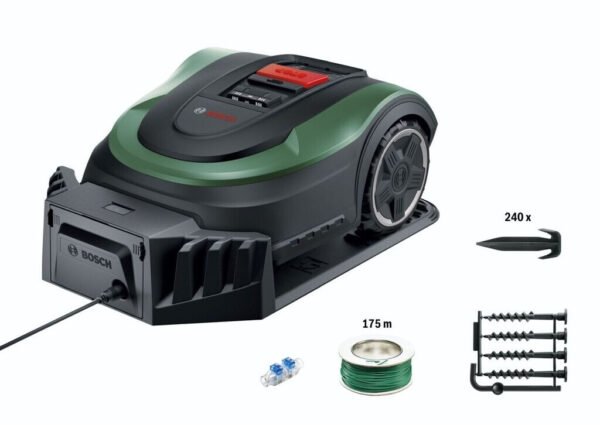 Im Lieferumfang sind neben der Ladestation auch ein 175 m Begrenzungskabel, 240 Befestigungshaken und weiteres Zubehör enthalten, sodass der Indego M+ 700 sofort einsatzbereit ist.