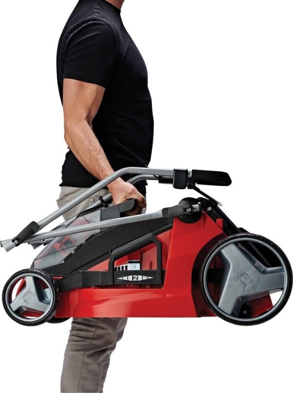 Der klappbare Führungsholm sorgt für eine einfache Lagerung und spart wertvollen Platz. Die großen Hinterräder verbessern die Manövrierfähigkeit, während das leichte Kunststoffgehäuse für eine angenehme Handhabung sorgt.